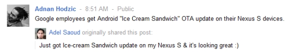 It seems now, however, that it won’t be too long now. A Google employee posted on Google+ that he got the Ice Cream Sandwich on his Nexus S and that ‘it’s looking great’. The update was later on deleted from the site but you can see a screenshot below.